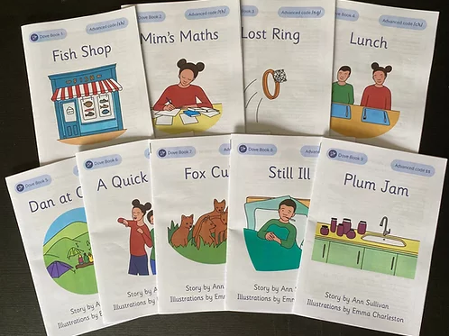 There are 9 books in the Dove series, covering the advanced code sounds: /sh/ /th/ /ng/ /ch/ /k/ (ck) /k//w/ (qu) /f/ (ff) /l/ (ll) /s/ (ss)